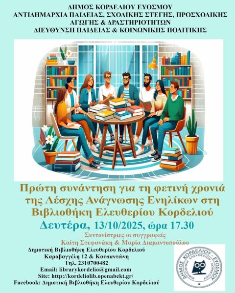 10-10-2025 Από: Δελτία Τύπου Η Λέσχη Ανάγνωσης της Δημοτικής Βιβλιοθήκης Ελευθερίου Κορδελιού ανοίγει την αυλαία της νέας σεζόν