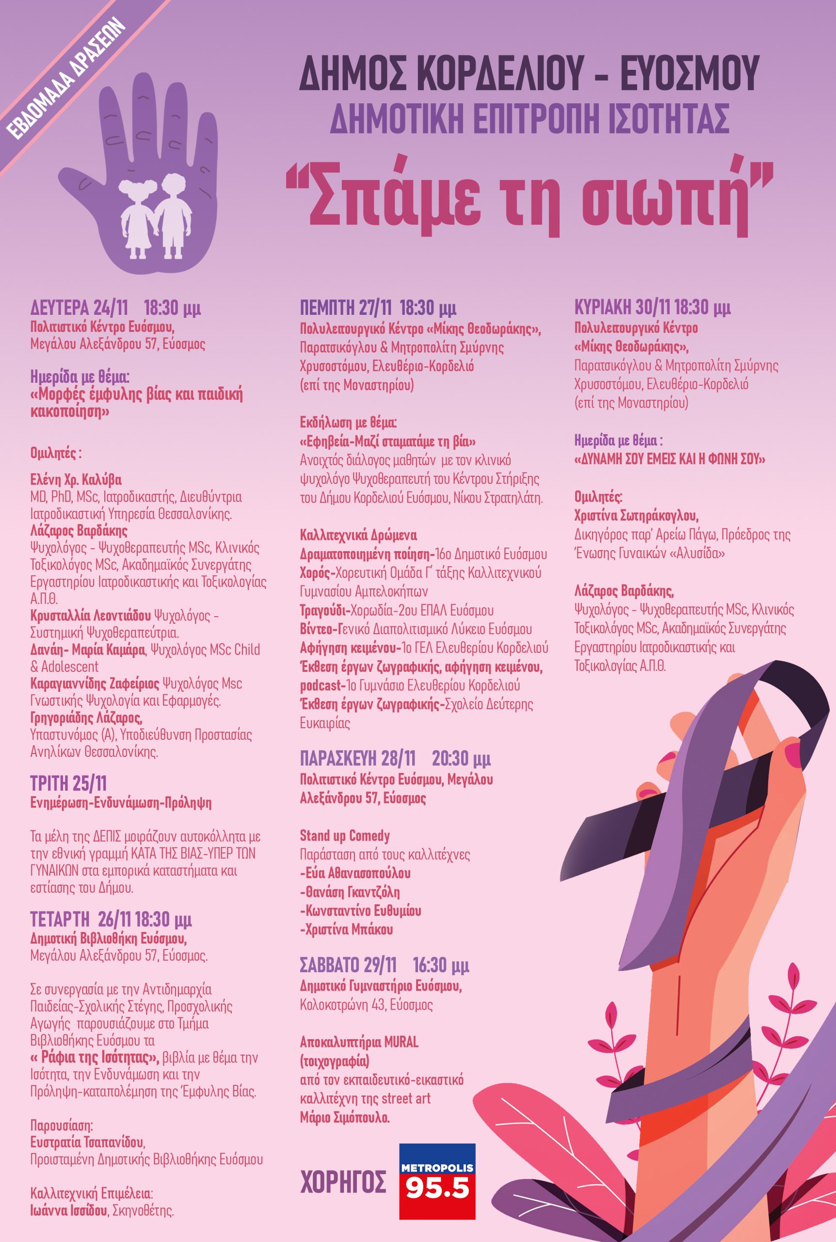 Ξεκινά την Δευτέρα 24 Νοεμβρίου και ολοκληρώνεται την Κυριακή 30 Νοεμβρίου, η εβδομαδιαία εκστρατεία που οργανώνει η Δημοτική Επιτροπή Ισότητας Κορδελιού Ευόσμου Δ.ΕΠ.ΙΣ-Κ.Ε) συμμετέχοντας στις δράσεις της Παγκόσμιας Ημέρας για την Εξάλειψη της Βίας κατά των Γυναικών- 25Νοεμβρίου.