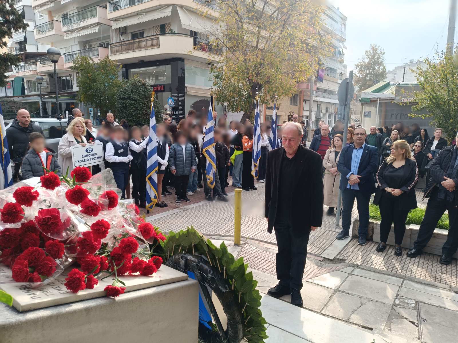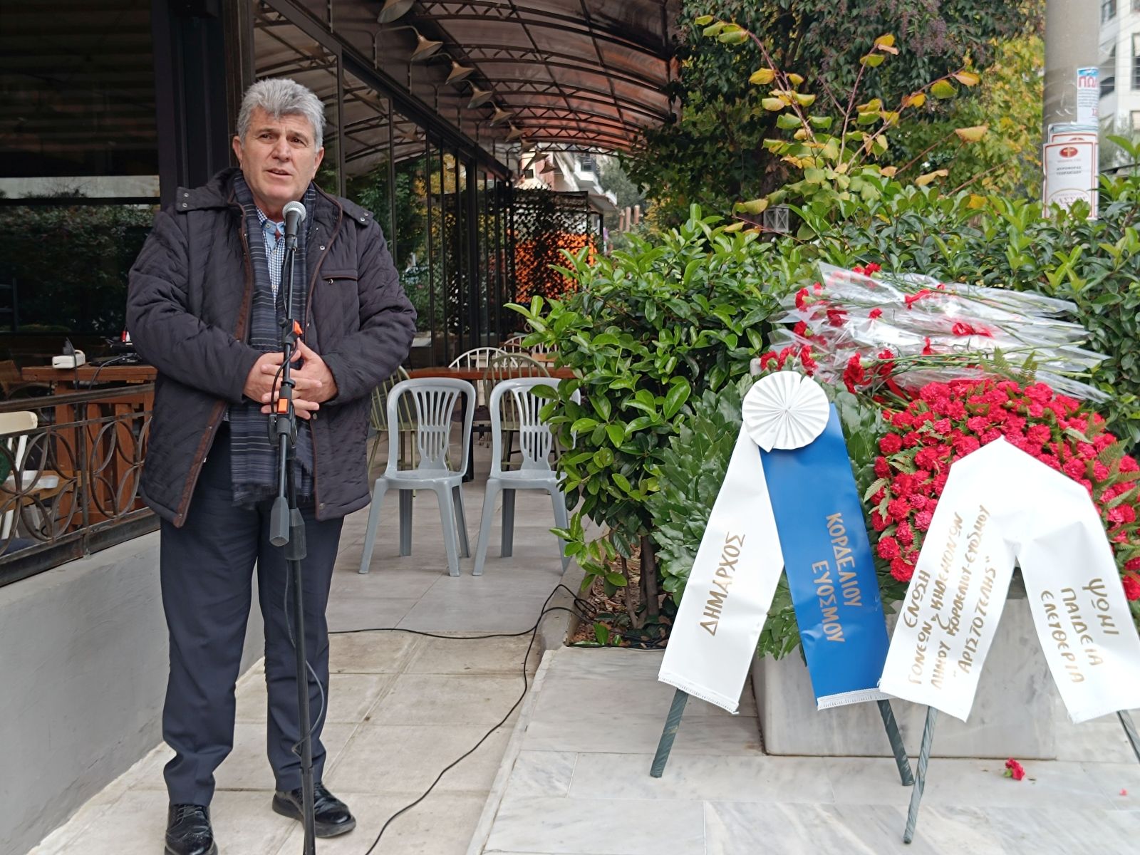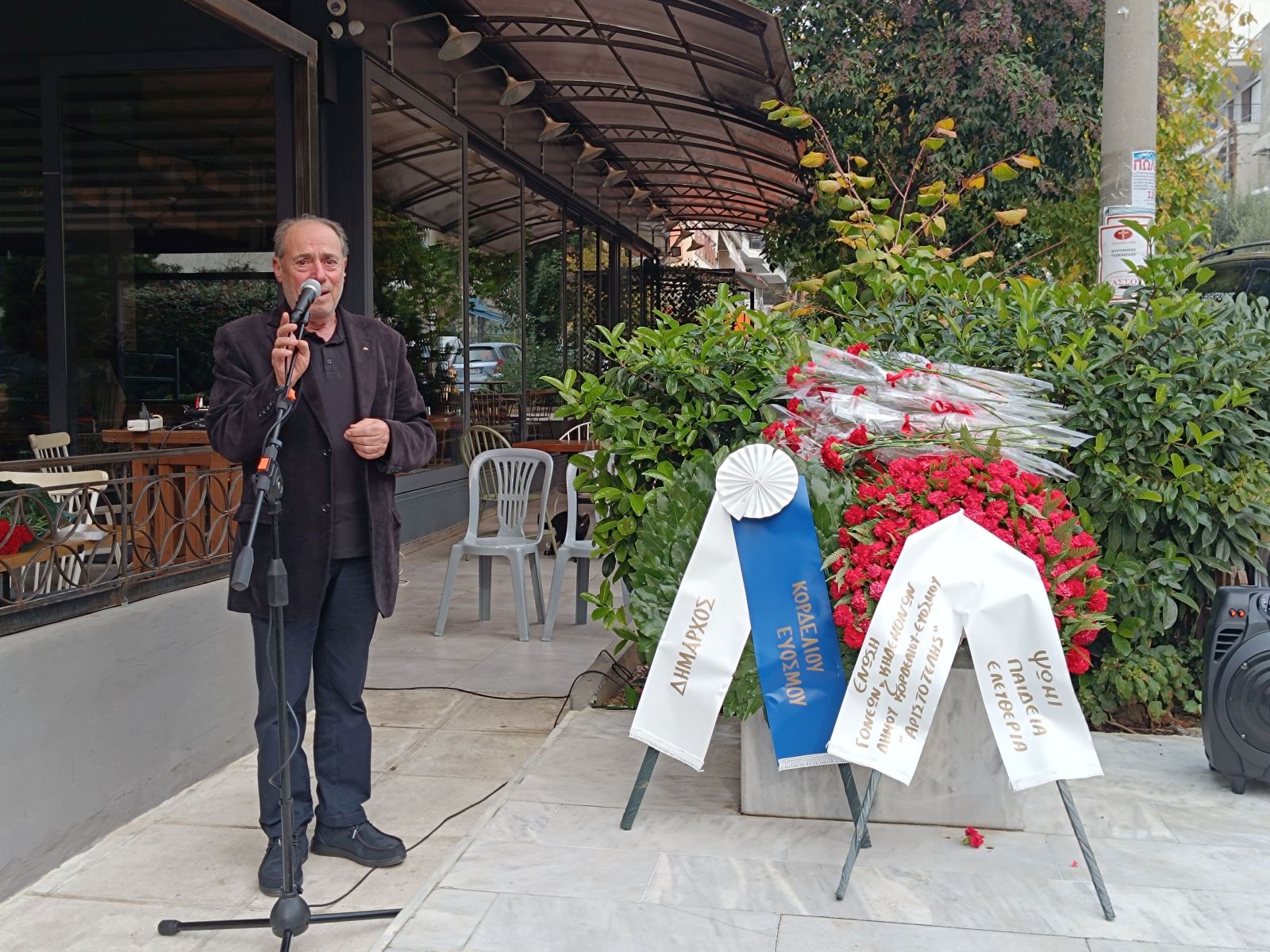 Το λόγο πήρε στη συνέχεια ο πρώην δήμαρχος Ελευθερίου – Κορδελιού και νυν δημοτικός σύμβουλος Κορδελιού – Ευόσμου, Στάθης Καϊτετζίδης, ο οποίος συγκινημένος παρουσίασε τη συγκλονιστική μαρτυρία συνεργάτη του Δήμου Κορδελιού – Ευόσμου, ο οποίος έζησε τα τραγικά γεγονότα του Πολυτεχνείου. Παράλληλα, απευθύνθηκε στους μαθητές, λέγοντάς τους ότι ο πρώτος νεκρός του Πολυτεχνείου ήταν ο 18χρονος Διονύσης Κομνηνός.