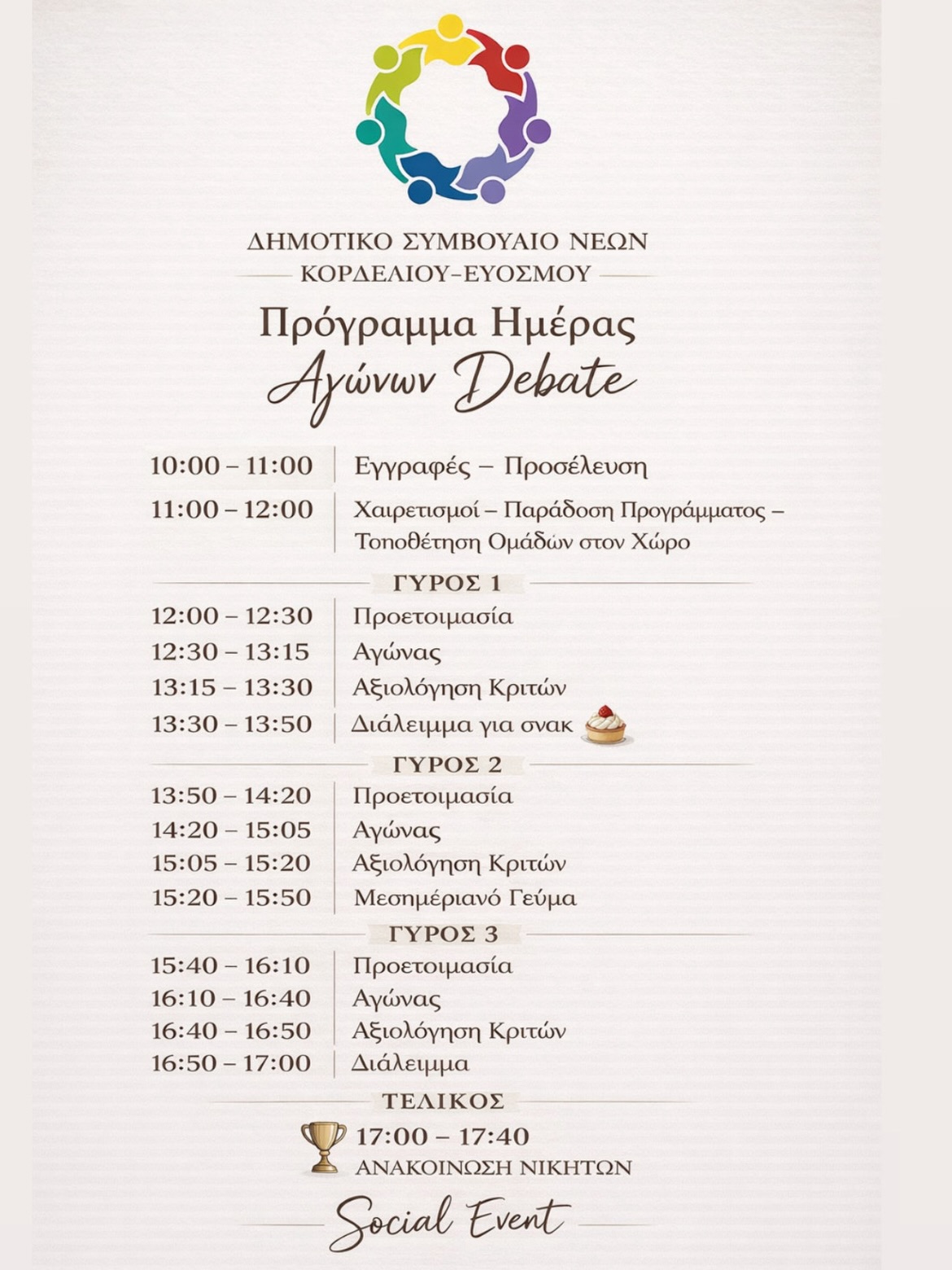 Με το σύνθημα “Η νεολαία έχει φωνή και στις 1 Μαρτίου θα ακουστεί δυνατά” το Συμβούλιο Νέων του Δήμου Κορδελιού–Ευόσμου διοργανώνει τον 1ο Διαγωνισμό Debate για μαθητές/τριες Γυμνασίου και Λυκείου, δημιουργώντας έναν ανοιχτό χώρο διαλόγου, επιχειρηματολογίας και ανταλλαγής ιδεών.
